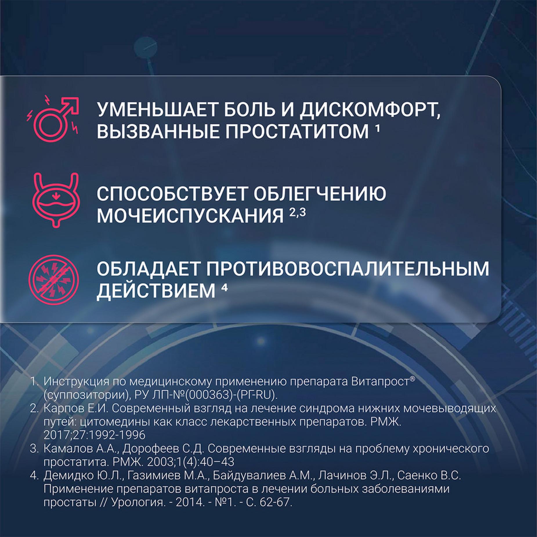 Лечение хронического простатита, состояний до и после оперативных вмешательств на предстательной железе должно быть комплексным, предполагающим наряду с назначением таблеток Витапрост® применение других групп лекарственных препаратов и немедикаментозных методов лечения.