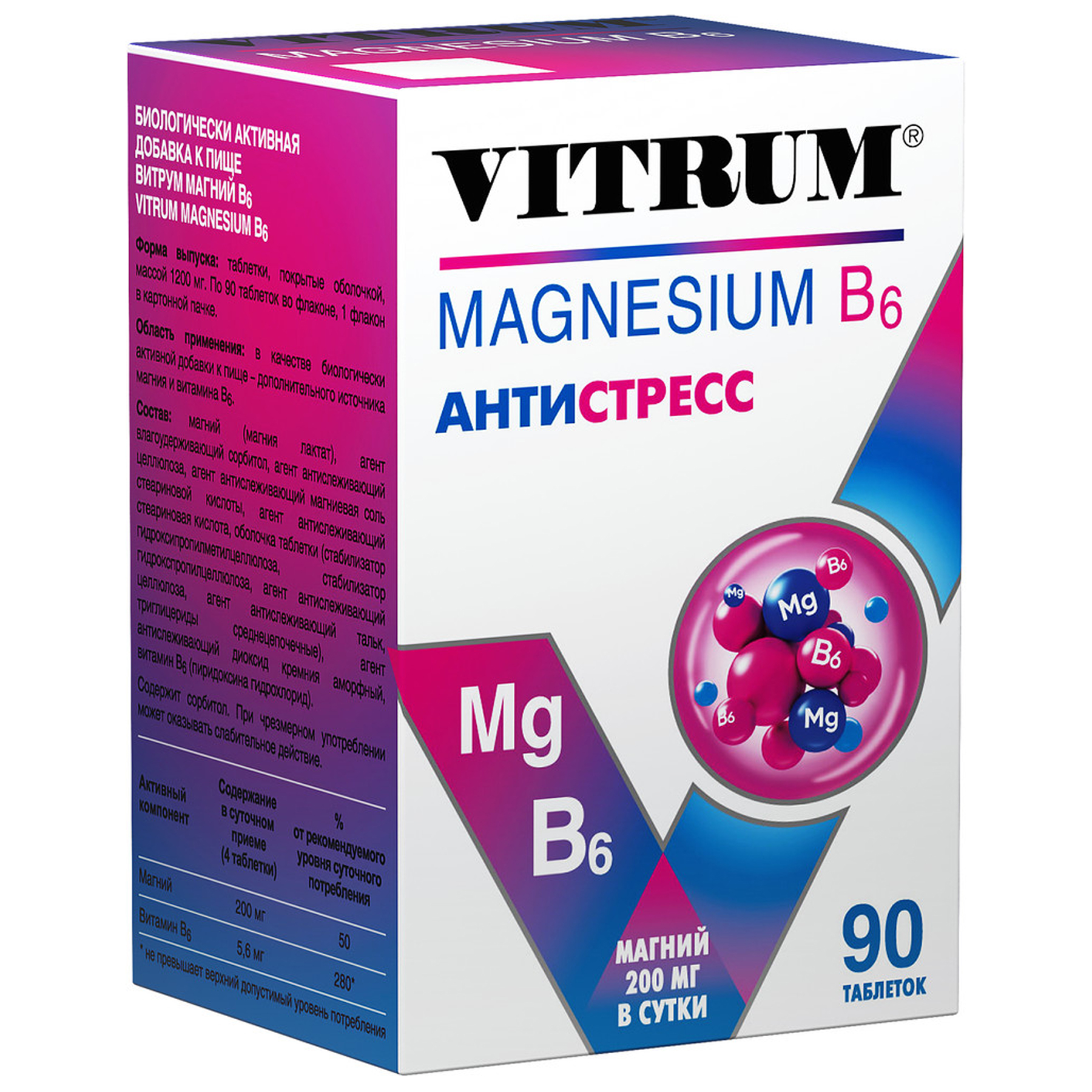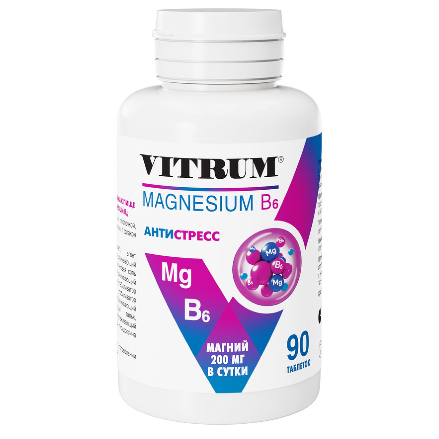 Магний (магния лактат), агент влагоудерживающий сорбитол, антислеживающий агент целлюлоза, антислеживающий агент магниевая соль стеариновой кислоты, антислеживающий агент стеариновая кислота, оболочка таблетки (стабилизатор гидроксипропилметилцеллюлоза, стабилизатор гидрокспропилцеллюлоза, антислеживающий агент целлюлоза, антислеживающий агент тальк, триглицериды среднецепочечные), антислеживающий агент диоксид кремния, витамин В6 (пиридоксина гидрохлорид).