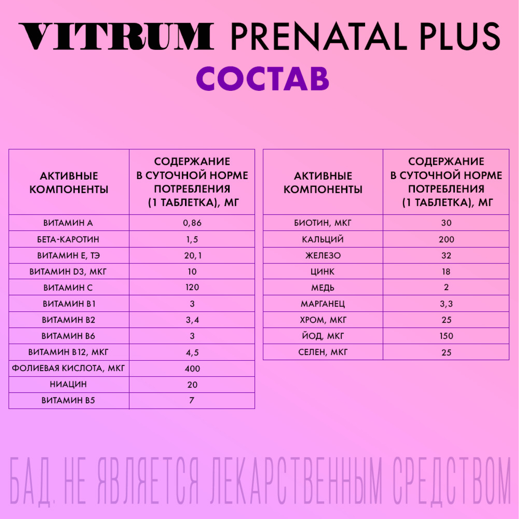 Состав: кальция карбонат, носитель целлюлоза микрокристаллическая, витамин C (аскорбиновая кислота), железа фумарат, витамин E (DL-альфа-токоферола ацетат), стабилизатор стеариновая кислота, магния оксид, стабилизатор кроскармеллоза, оболочка таблетки Опадрай II белый (стабилизатор гидроксипропилметилцеллюлоза, краситель титана диоксид, носитель полидекстроза, антислеживающий агент тальк, мальтодекстрин, триглицериды среднецепочечные), стабилизатор кремния диоксид, цинка оксид, никотинамид, стабилизатор магниевая соль стеариновой кислоты, марганца сульфат, кальция-D-пантотенат, бетакаротен, витамин A (ретинола ацетат), фолиевая кислота, витамин D3 (колекальциферол), витамин B6 (пиридоксина гидрохлорид), витамин B1 (тиамина нитрат), витамин B2 (рибофлавин), D-биотин, хлорид хрома, меди оксид, калия йодид, натрия селенат, витамин B12 (цианокобаламин).
