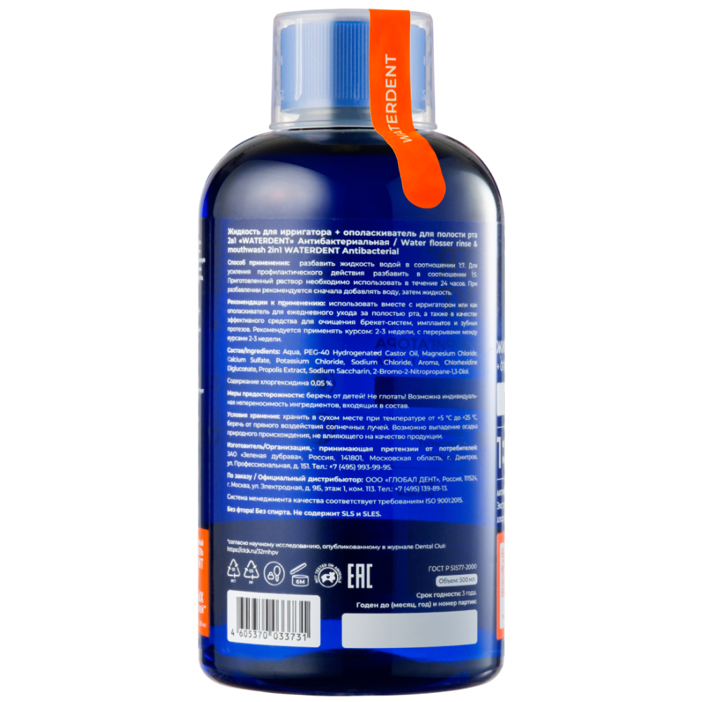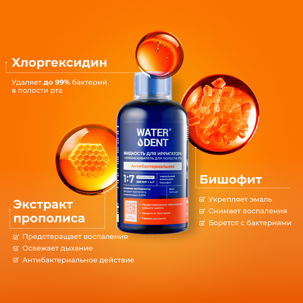 Жидкость для ирригатора + ополаскиватель для полости рта 2в1 «WATERDENT» Антибактериальная эффективно защищает от бактерий, предотвращает образование налета и освежает дыхание. Идеальное средство после стоматологических процедур.