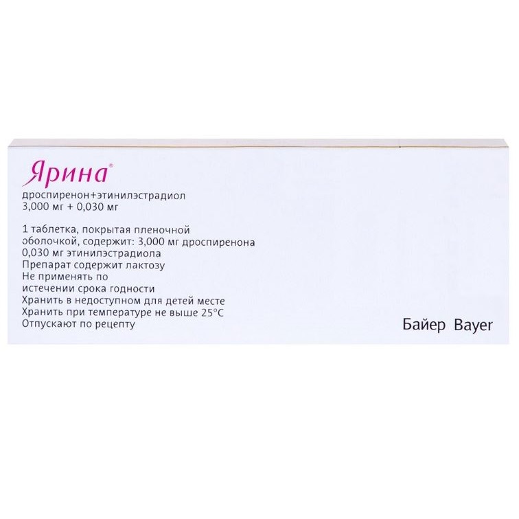 Дроспиренон, входящий в состав препарата Ярина®, обладает антиминералокортикоидной активностью и способен предупреждать увеличение массы тела и появление других симптомов (например, отеков), связанных с эстрогензависимой задержкой жидкости. Дроспиренон оказывает положительное воздействие на предменструальный синдром. В сочетании с этинилэстрадиолом дроспиренон демонстрирует благоприятный эффект на липидный профиль, характеризующийся повышением липопротеинов высокой плотности. Дроспиренон также обладает антиандрогенной активностью и способствует уменьшению угрей (акне), жирности кожи и волос (себореи). Эти особенности дроспиренона следует учитывать при выборе контрацептива женщинам с гормонозависимой задержкой жидкости, а также женщинам с акне и себореей.