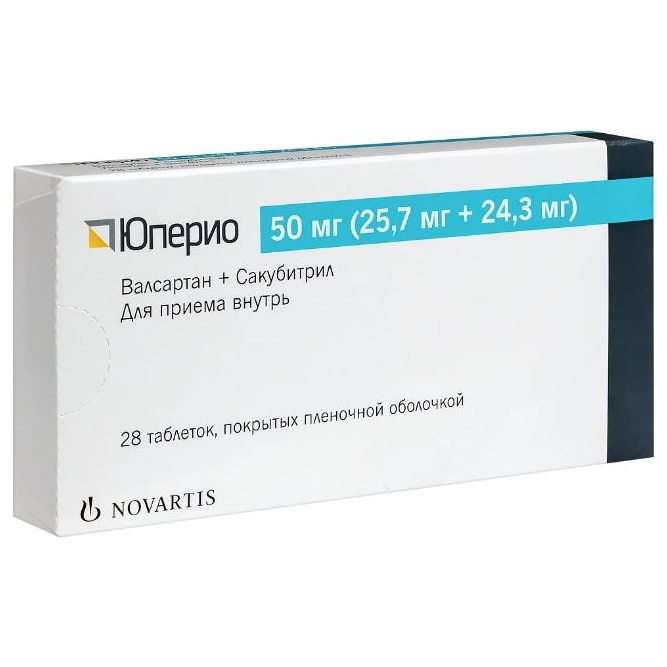 Активное вещество: сакубитрила и валсартана гидратный комплекс натриевых солей 56.551 мг, в пересчете на кислотную форму безводную 50 мг, что соответствует содержанию валсартана 25.7 мг, что соответствует содержанию сакубитрила 24.3 мг
