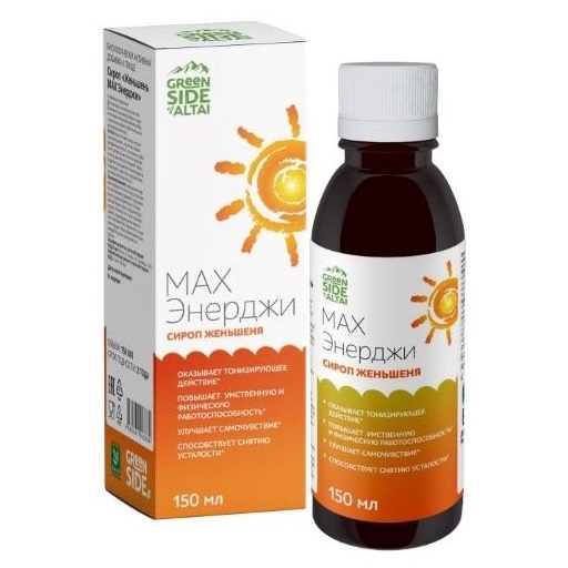 Биологически активная добавка к пище "Сироп "Женьшень МАХ Энерджи" оказывает тонизирующее действие, повышает умственную и физическую работоспособность, улучшает самочувствие, способствует снятию усталости.*