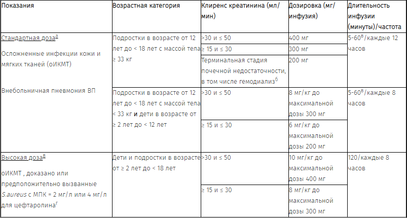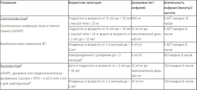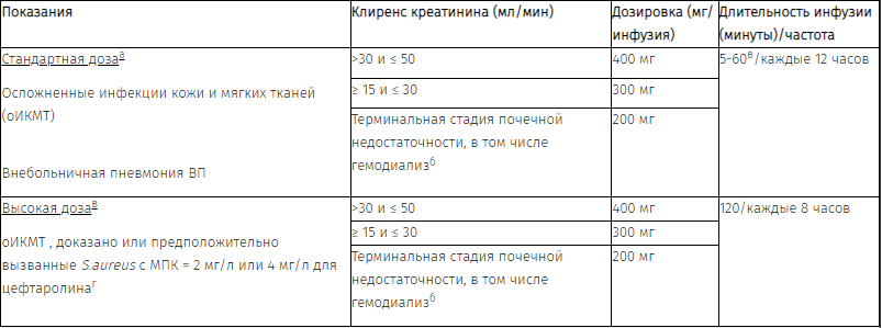 Для лечения осложненных инфекций кожи и мягких тканей, доказано или предположительно вызванных Staphylococcus aureus (S. aureus) c MПK цефтаролина < 2 мг/л, дозировка препарата Зинфоро® составляет 600 мг каждые 12 часов в виде внутривенной инфузии продолжительностью 5-60 минут (стандартная доза), с соответствующим снижением дозы для пациентов детского возраста (Таблица 2).