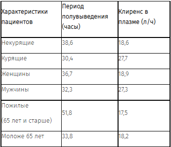 Основным циркулирующим метаболитом является 10-N-глюкуронид, который теоретически не проникает через гематоэнцефалический барьер. Изоферменты CYP1A2 и CYP2D6 цитохрома Р450 участвуют в образовании N-дезметил и 2- гидроксиметил метаболитов оланзапина. Оба метаболита в исследованиях на животных обладали значительно менее выраженной фармакологической активностью in vivo, чем оланзапин. Основная фармакологическая активность препарата обусловлена исходным веществом - оланзапином. У здоровых добровольцев после перорального приема средний период полувыведения составил 33 часа (21-54 часа для 5-95%), а средний клиренс оланзапина в плазме - 26 л/ч (12-47 л/ч для 5-95%). Фармакокинетические показатели оланзапина варьируют в зависимости от курения, пола и возраста (см. таблицу):