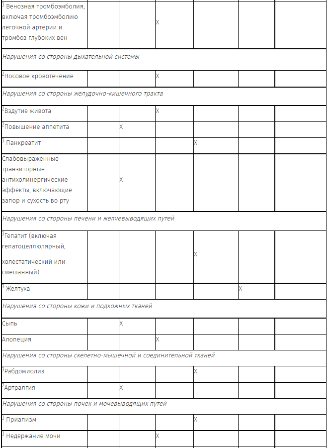 В приведенной ниже таблице изложены основные побочные эффекты и их частота, зарегистрированные во время клинических исследований и/или в пострегистрационном периоде со следующей частотой: очень часто (≥ 10%), часто (< 10% и ≥ 1%), нечасто (< 1% и ≥ 0,1%), редко (< 0,1% и ≥ 0,01%), очень редко (< 0,01%), частота неизвестна (частота не может быть определена по имеющимся данным).