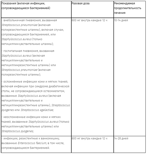Пациентов, которым в начале терапии препарат назначили в/в, в дальнейшем можно перевести на любую лекарственную форму препарата для приема внутрь, при этом подбор дозы не требуется, т.к. биодоступность линезолида при приеме внутрь составляет почти 100%. Продолжительность лечения зависит от возбудителя, локализации и тяжести инфекции, а также от клинического эффекта.