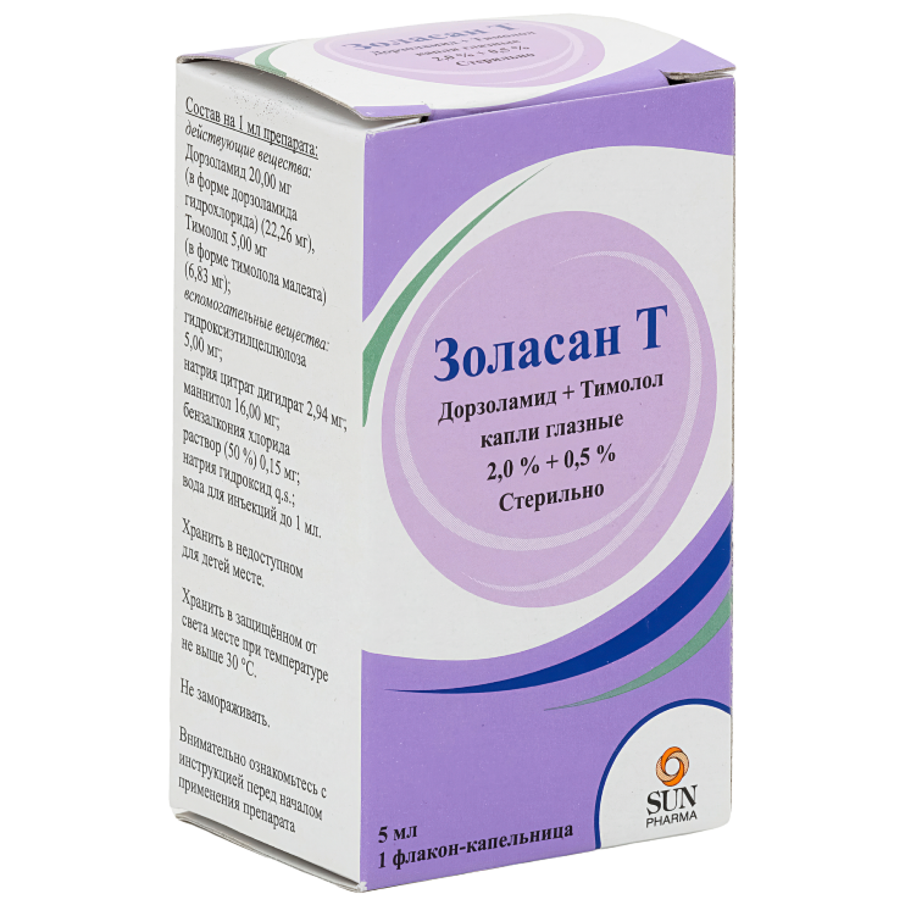 Золасан Т содержит два действующих вещества: дорзоламида гидрохлорид и тимолола малеат, каждый из которых снижает повышенное внутриглазное давление за счёт снижения секреции внутриглазной жидкости. Совместное действие этих веществ в составе комбинированного препарата Золасан Т приводит к более выраженному снижению внутриглазного давления.