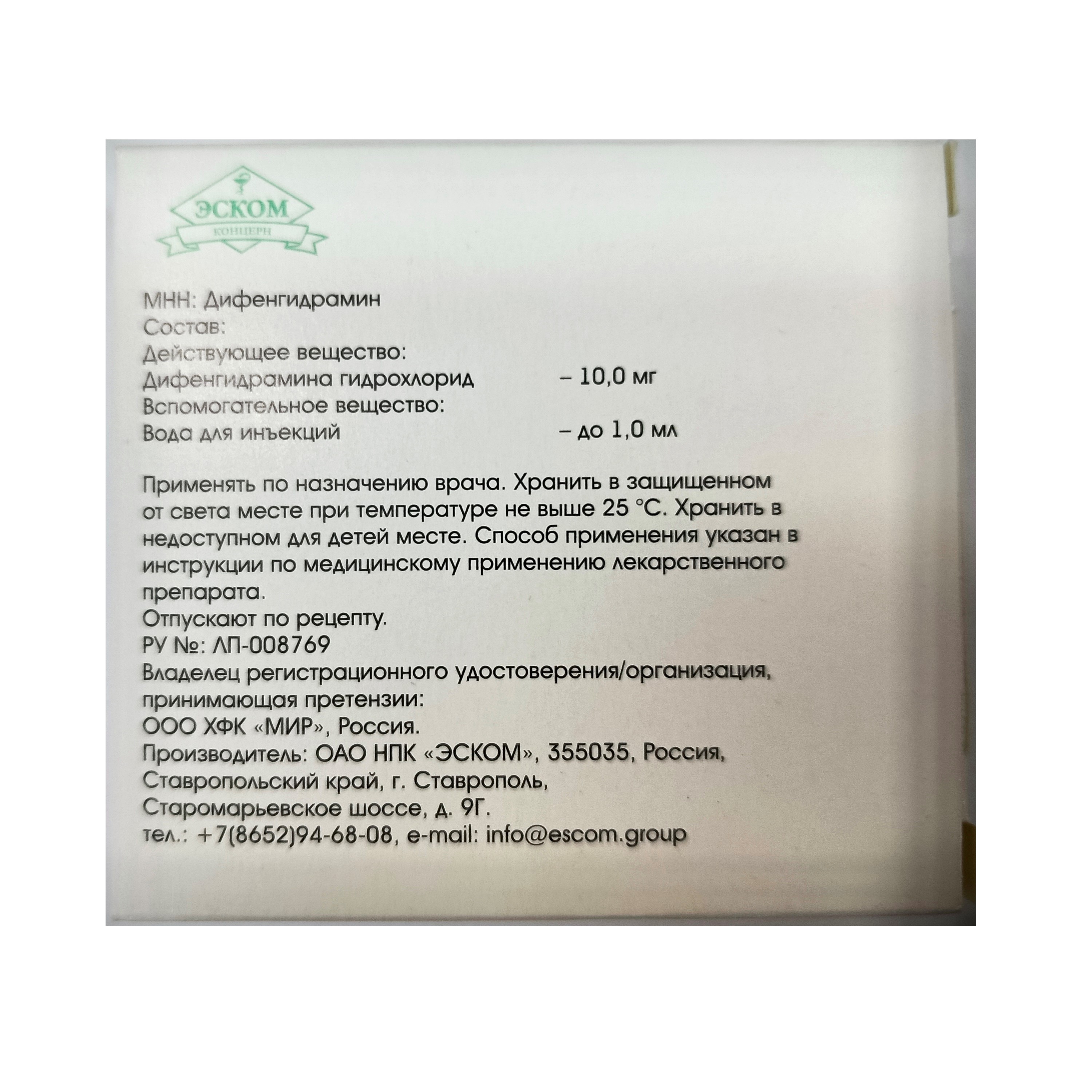 Димедрол 1% 1 мл 10 шт раствор для внутривенного и внутримышечного введения