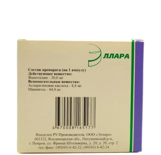 Фамотидин 20 мг/мл 5 шт лиофилизат для приготовления раствора для внутривенного введения ампулы в комплекте с растворителем 5 мл 5 шт