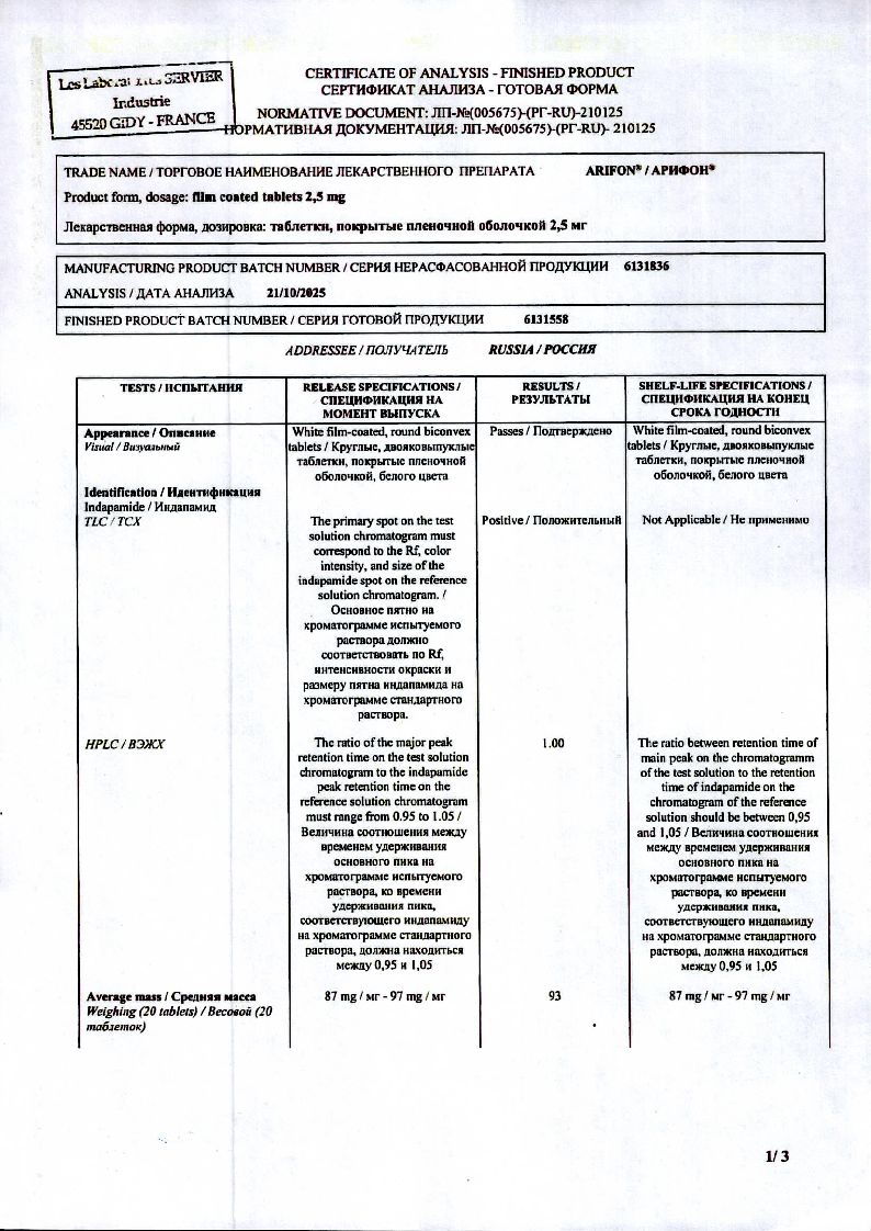 Арифон 2,5 мг 30 шт таблетки покрытые пленочной оболочкой