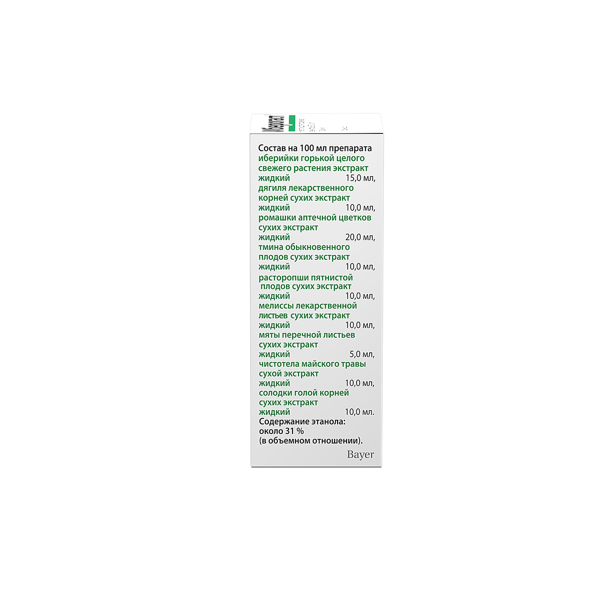В Иберогасте содержится этиловый спирт – 29,5-32,6%. В разовой дозировке в количестве присутствует до 24 мг, в предельной суточной дозе – до 72 мг абсолютного этилового спирта.