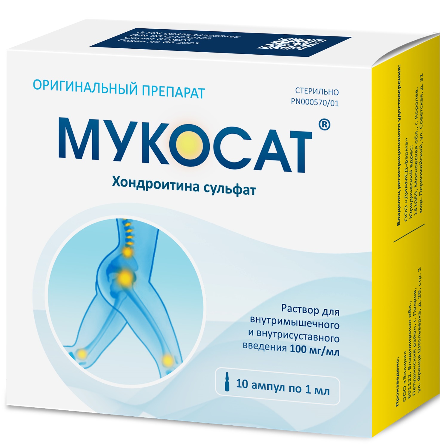 Мукосат в основном накапливается в хрящевой ткани, которая формирует суставы. Он проникает в суставную полость через синовиальную оболочку. Спустя 15 минут после укола препарат обнаруживается в синовиальной жидкости, потом проникает в хрящ сустава, где его пиковая концентрация достигается через двое суток.