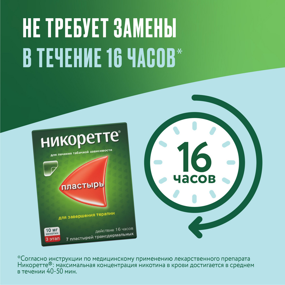 Сразу после пробуждения накладывают пластырь на неповрежденный кожный участок и убирают его перед сном. Кожные покровы должны быть чистыми и сухими. Каждый день выбирается новый участок. Терапия таким средством имитирует колебания никотиновой концентрации на протяжении дня. Использование пластыря в дневное время не вызывает нарушений, которые наблюдаются при поступлении никотина во время сна в организм.