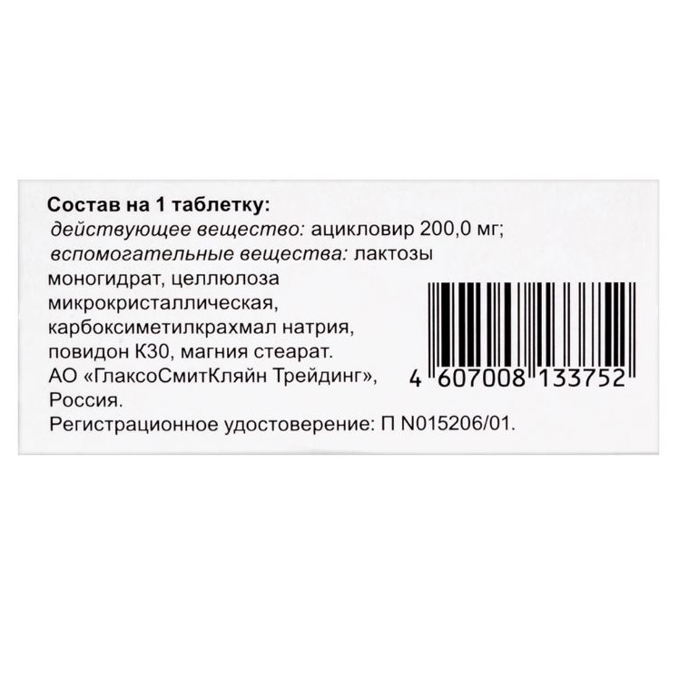 - лечение герпес-инфекции кожи и слизистых: 200 мг внутрь 5 раз в сутки (каждые 4 часа, кроме ночи) 5 дней (возможна пролонгация при тяжелых случаях). При выраженном иммунодефиците или нарушении всасывания доза увеличивается до 400 миллиграмм. Лечение желательно начинать как можно раньше, при рецидивах — в продромальном периоде или при первых признаках сыпи;